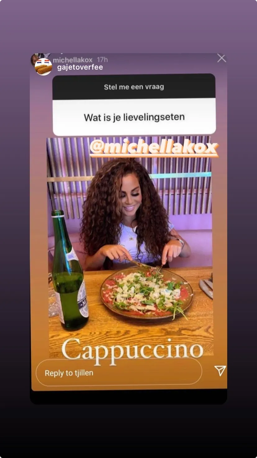 Zo vraagt een volger aan Michella wat haar lievelingseten is. Ze deelt daarbij een foto van het klassiek Italiaanse voorgerecht carpaccio. Alleen ze schrijft daarbij 'cappuccino'. Je begrijpt; een foutje natuurlijk. Maar wel een foutje waar men om kan lachen...