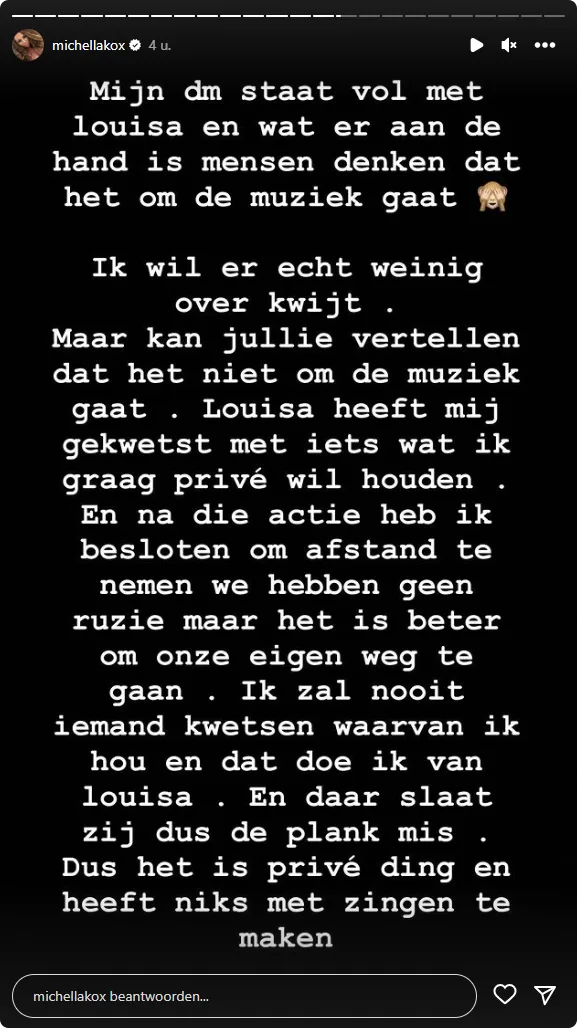 "Ik wil er echt weinig over kwijt", zo begint Michella in haar Instagram Stories. "Maar kan jullie vertellen dat het niet om de muziek gaat. Louisa heeft mij gekwetst met iets wat ik graag privé wil houden."