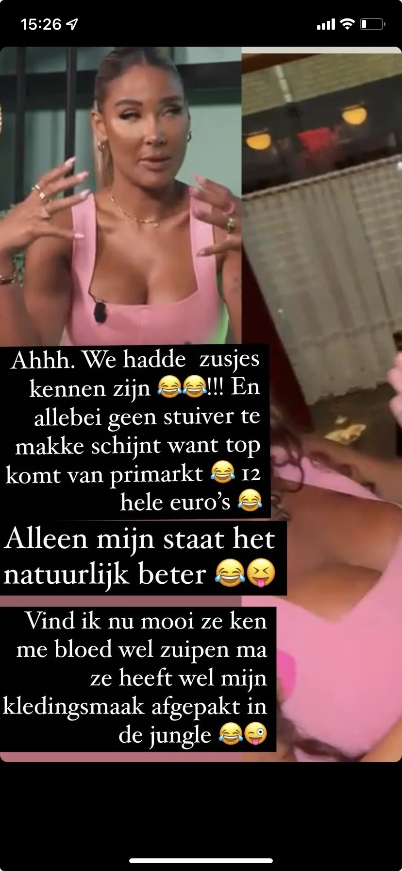 "Ze kan mijn bloed wel zuipen maar ze heeft wel mijn kledingsmaak afgepakt in de jungle”, schrijft Michella bij foto’s van hetzelfde topje. Ze vervolgt: "Allebei geen stuiver te makken schijnt, want de top komt van Primark. 12 hele euro’s. Alleen mij staat het natuurlijk beter.”