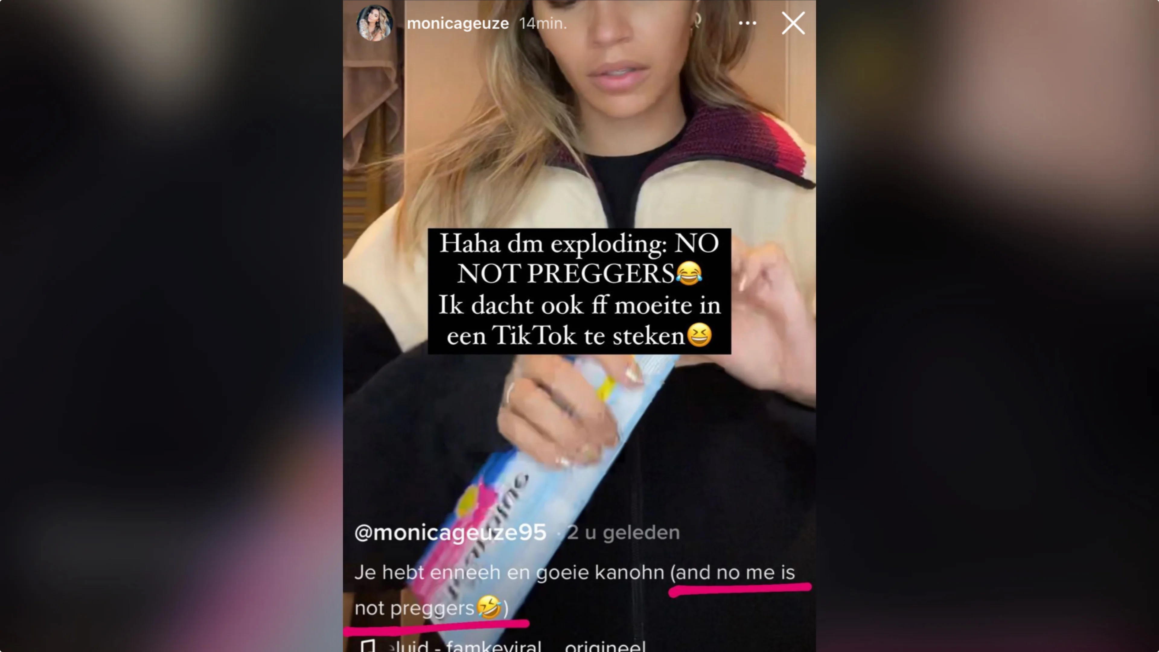 De inbox van Monica stroomt vol met de vraag: ben je zwanger?! Maar dat blijkt niet het geval te zijn. In haar Stories op Instagram laat ze met lachende emoji's weten: "DM exploding. No, not preggers. Ik dacht ook ff moeite in een TikTok te steken."