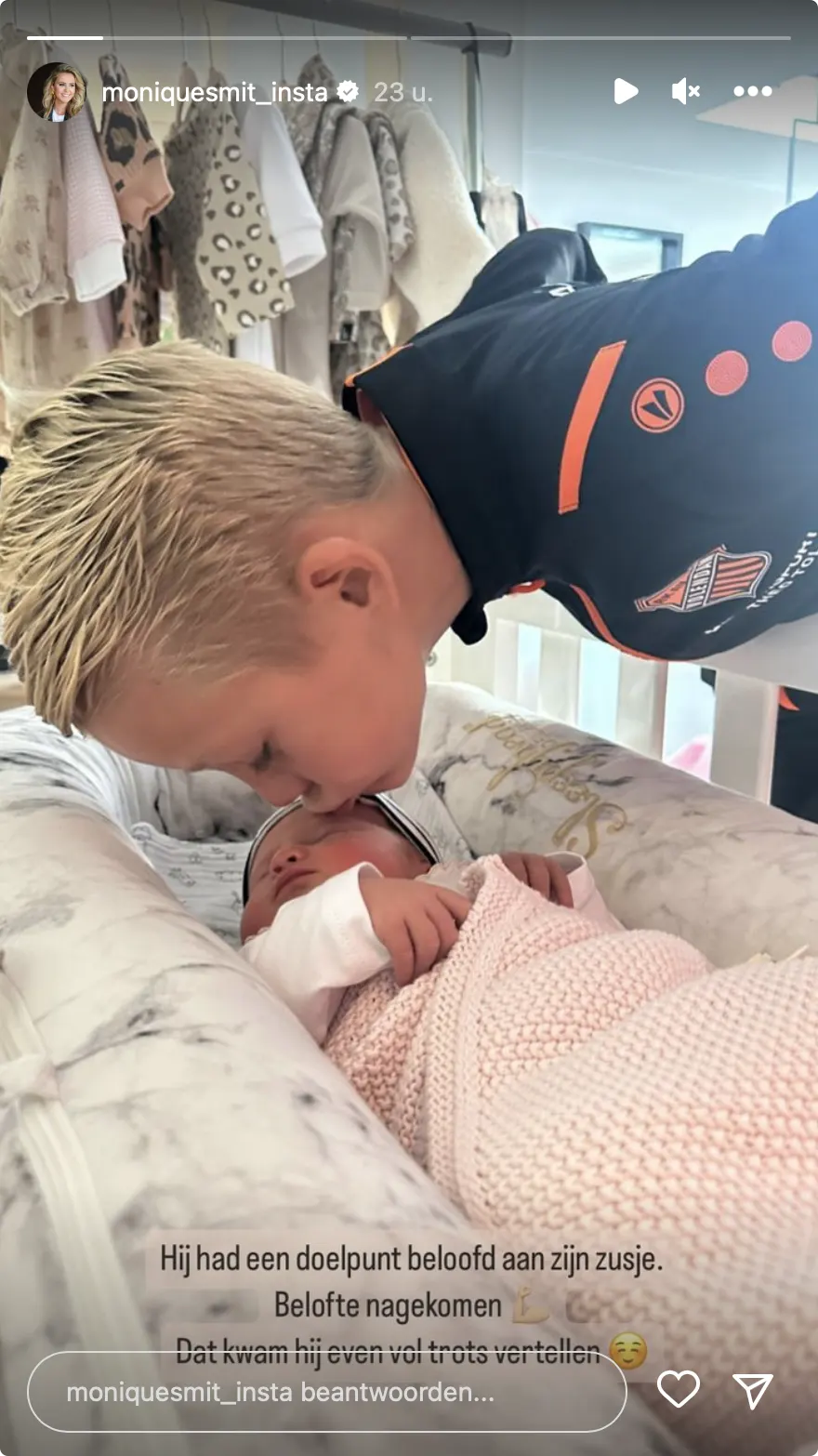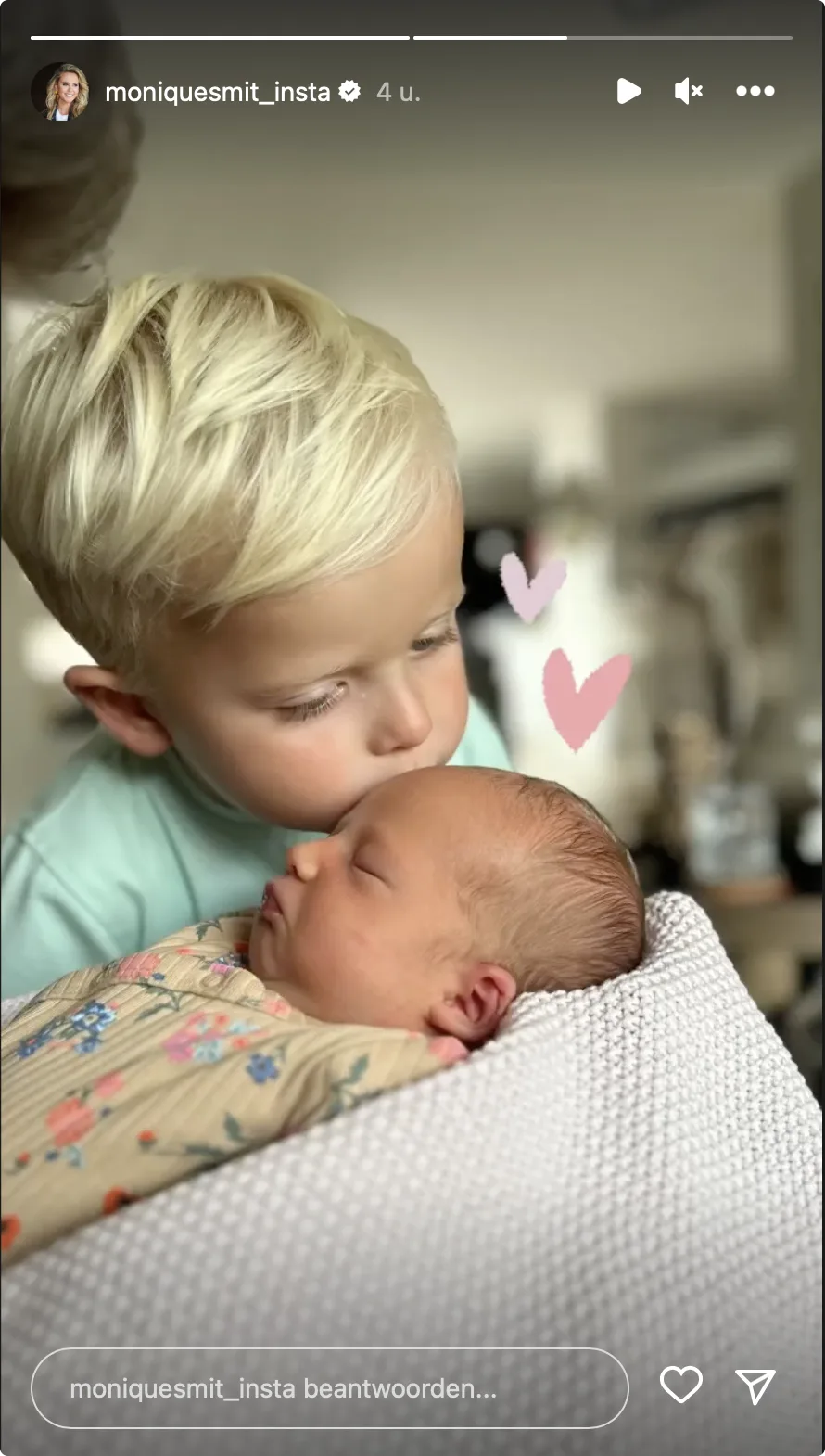 Monique Smit is inmiddels moeder van drie prachtige kindjes. De oudste twee, Noah en Luca, zijn enorm trots op hun zusje. Op de foto's die de blondine deelt op Instagram, is te zien dat de twee jongens Lovi een kusje geven.