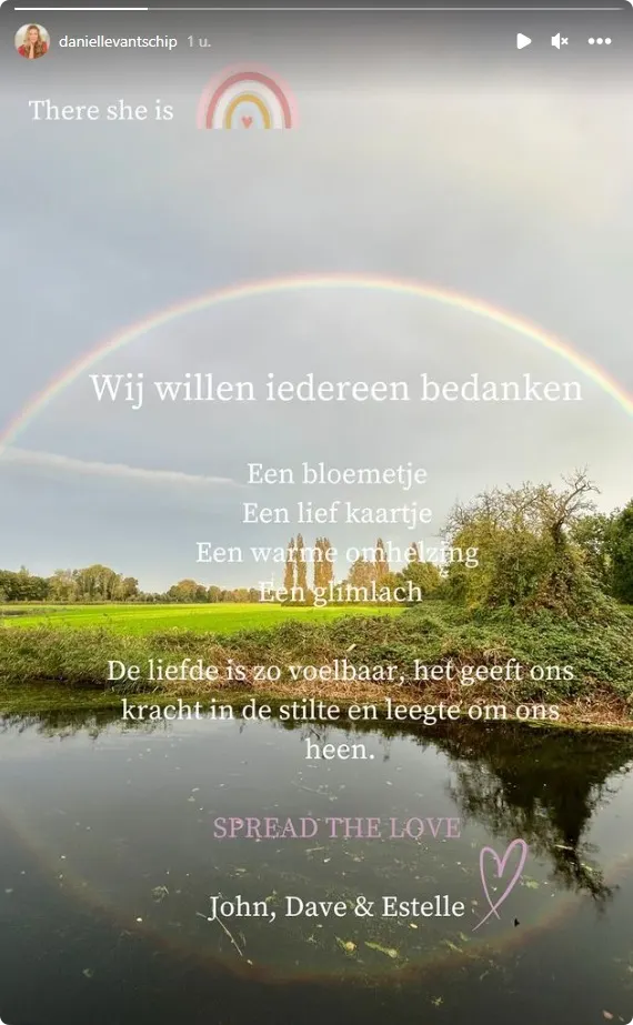 De nabestaanden van Daniëlle, die vorige week dinsdag op 55-jarige leeftijd overleed (zie video), schrijven ook in hun Instagram Story: "De liefde is zo voelbaar, het geeft ons kracht in de stilte en leegte om ons heen."