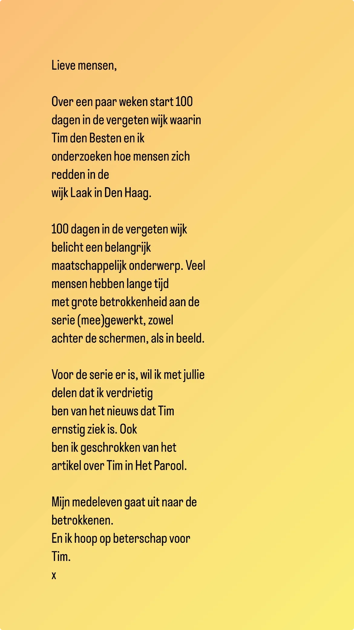 Nicolaas heeft op Instagram een korte verklaring geplaatst, omdat over een kleine twee weken hun nieuwe serie 100 Dagen in de vergeten wijk van start gaat.