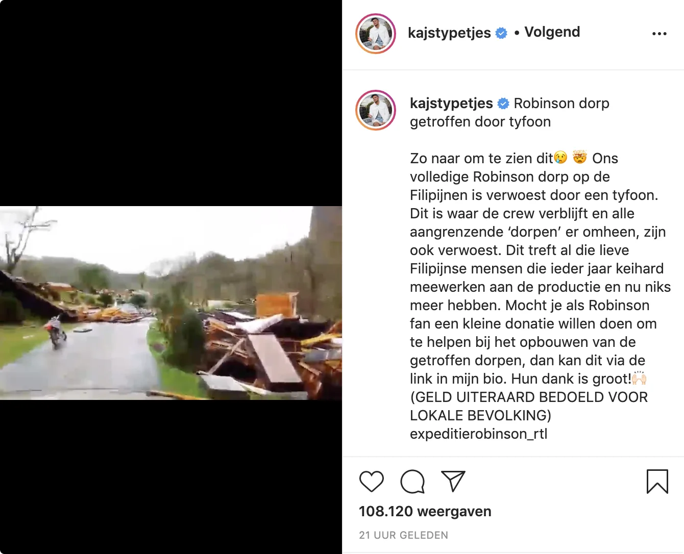 En Kaj reageert: "Robinson dorp getroffen door tyfoon. Zo naar om te zien dit. Ons volledige Robinson dorp op de Filipijnen is verwoest door een tyfoon. Dit is waar de crew verblijft en alle aangrenzende ‘dorpen’ er omheen, zijn ook verwoest. Dit treft al die lieve Filipijnse mensen die ieder jaar keihard meewerken aan de productie en nu niks meer hebben. Mocht je als Robinson fan een kleine donatie willen doen om te helpen bij het opbouwen van de getroffen dorpen, dan kan dit via de link in mijn bio. Hun dank is groot!🙌🏻 (GELD UITERAARD BEDOELD VOOR LOKALE BEVOLKING)"