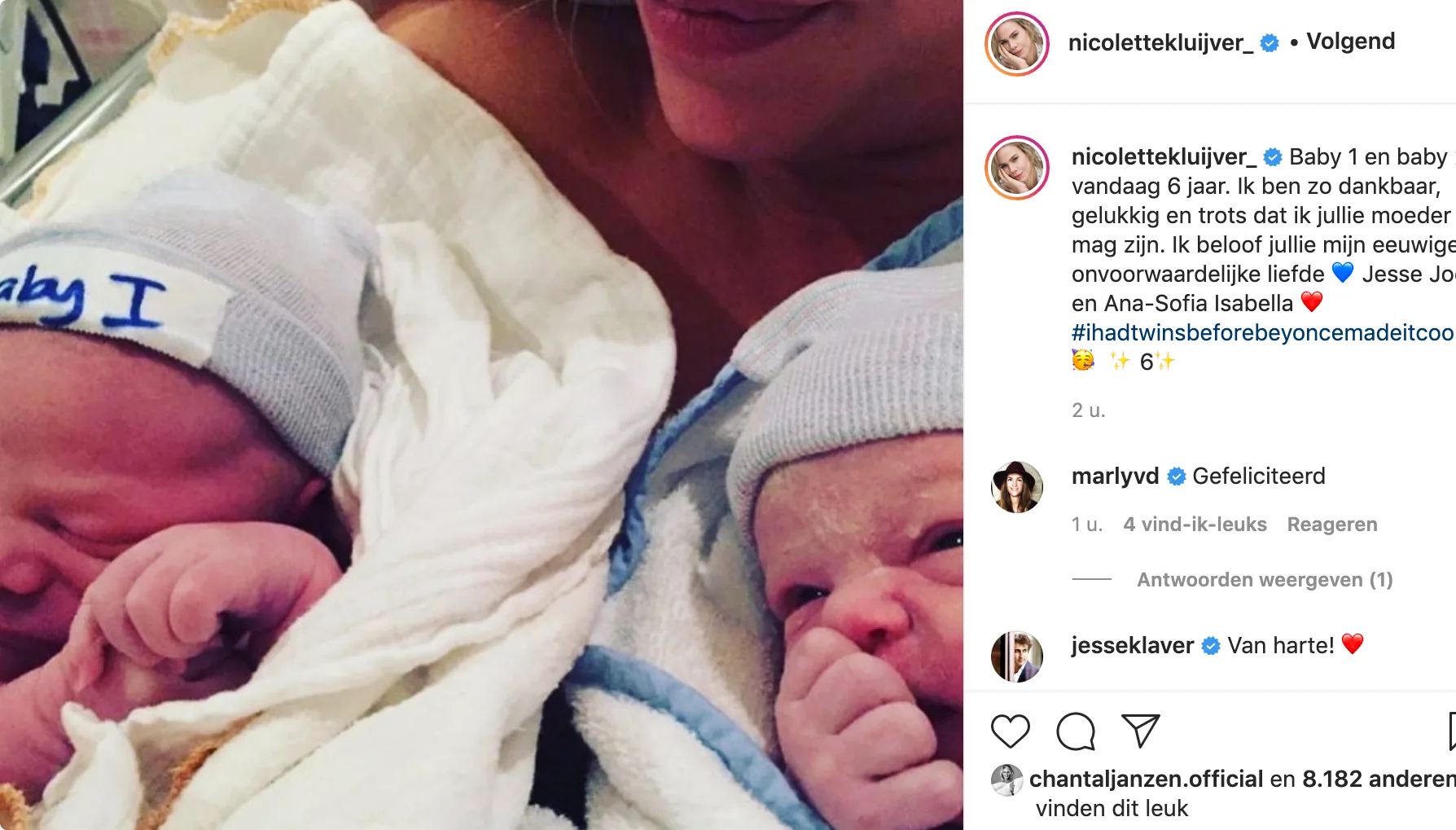 Op Instagram post ze een superschattige babyfoto van de twee en schrijft: "Baby 1 en baby 2 vandaag 6 jaar. Ik ben zo dankbaar, gelukkig en trots dat ik jullie moeder mag zijn. Ik beloof jullie mijn eeuwige onvoorwaardelijke liefde. Jesse Joost en Ana-Sofia Isabella #ihadtwinsbeforebeyoncemadeitcool. 6."