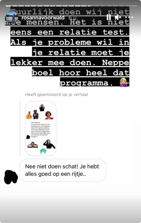 Even later laat ze echter duidelijk haar antwoord weten. "Tuurlijk doen wij niet mee mensen. Het is niet eens een relatietest. Als je problemen wil in je relatie moet je lekker meedoen. Neppe boel hoor, heel dat programma."