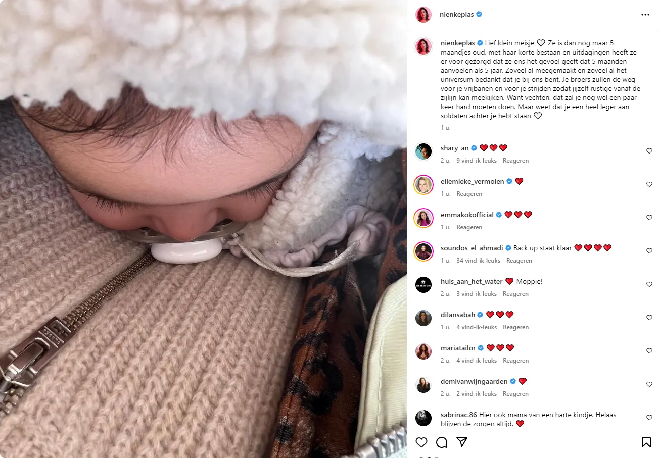 Harley, het dochtertje van Nienke Plas, is nog maar vijf maanden oud, maar 'met haar korte bestaan en uitdagingen heeft ze er voor gezorgd dat ze ons het gevoel geeft dat 5 maanden aanvoelen als 5 jaar'. Dat schrijft de 37-jarige Plas in een bericht op Instagram. Begin dit jaar kwam Harley in het ziekenhuis terecht, waar zij met spoed geopereerd moest worden aan haar hart.