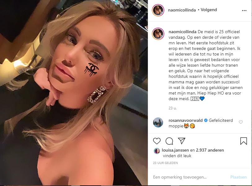 Op Instagram schrijft ze: "De meid is 25 officieel (...) Op een derde of vierde van mijn leven. Het eerste hoofdstuk zit erop en het tweede gaat beginnen. Ik wil iedereen die tot nu toe in mijn leven is en is geweest bedanken voor alle wijze lessen liefde humor tranen en geluk. Op naar het volgende hoofdstuk waarin ik hopelijk officieel mama mag gaan worden, succesvol in wat ik doe en nog gelukkiger samen met mijn man. Hiep Hiep HO era voor deze meid. ?".