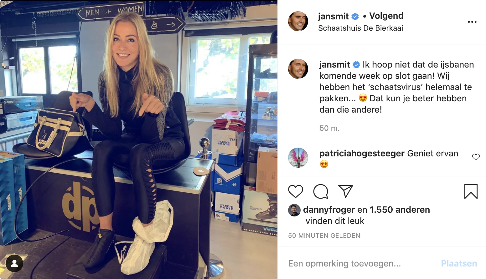 Dat laat Jan weten op zijn Instagram. Zo schrijft hij bij onderstaande foto: "Ik hoop niet dat de ijsbanen komende week op slot gaan! Wij hebben het ‘schaatsvirus’ helemaal te pakken... 😍 Dat kun je beter hebben dan die andere!"