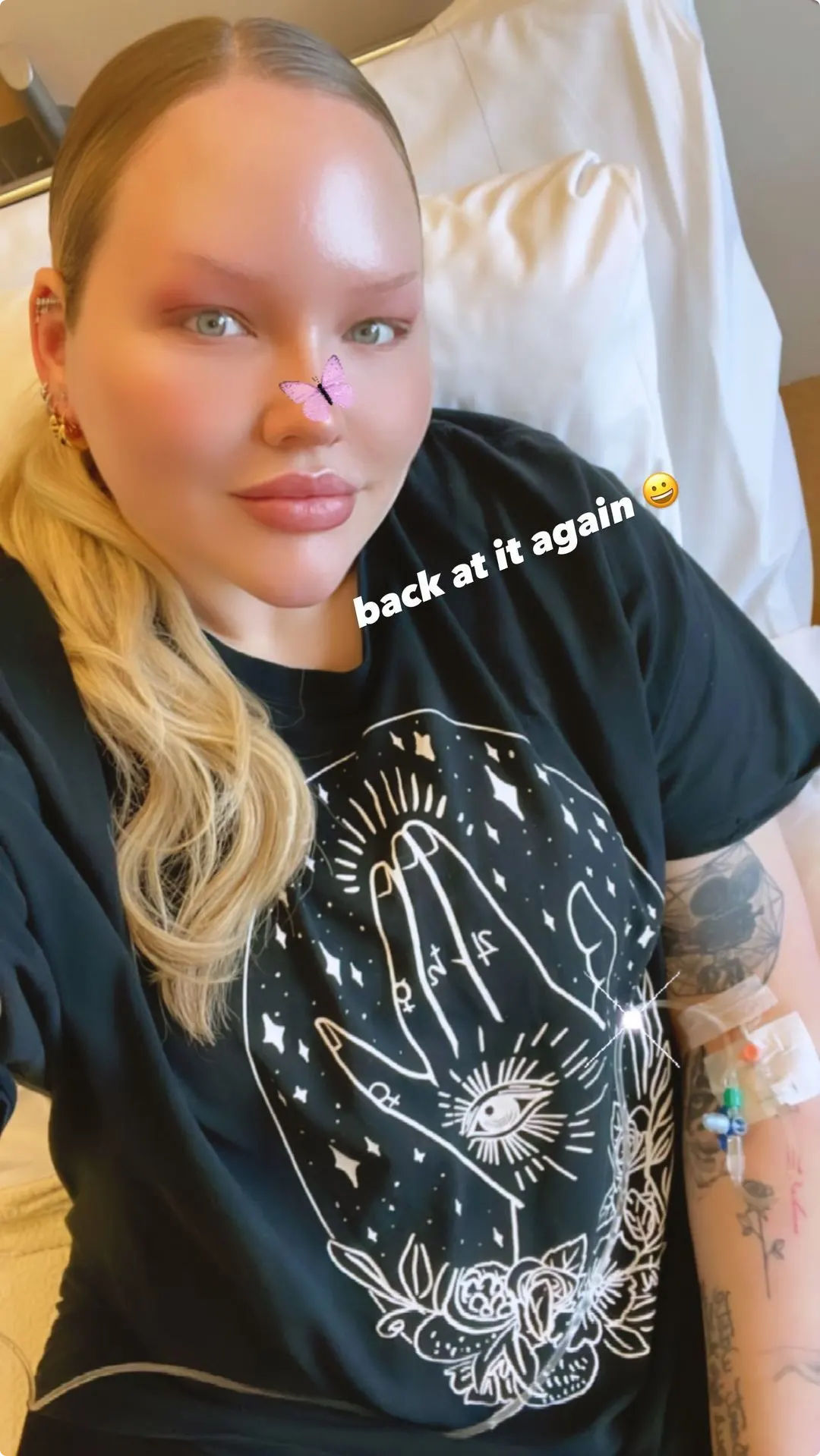 Nikkie de Jager ligt opnieuw in het ziekenhuis. Op Instagram story deelt de make-up ster dat ze weer aan het infuus ligt.