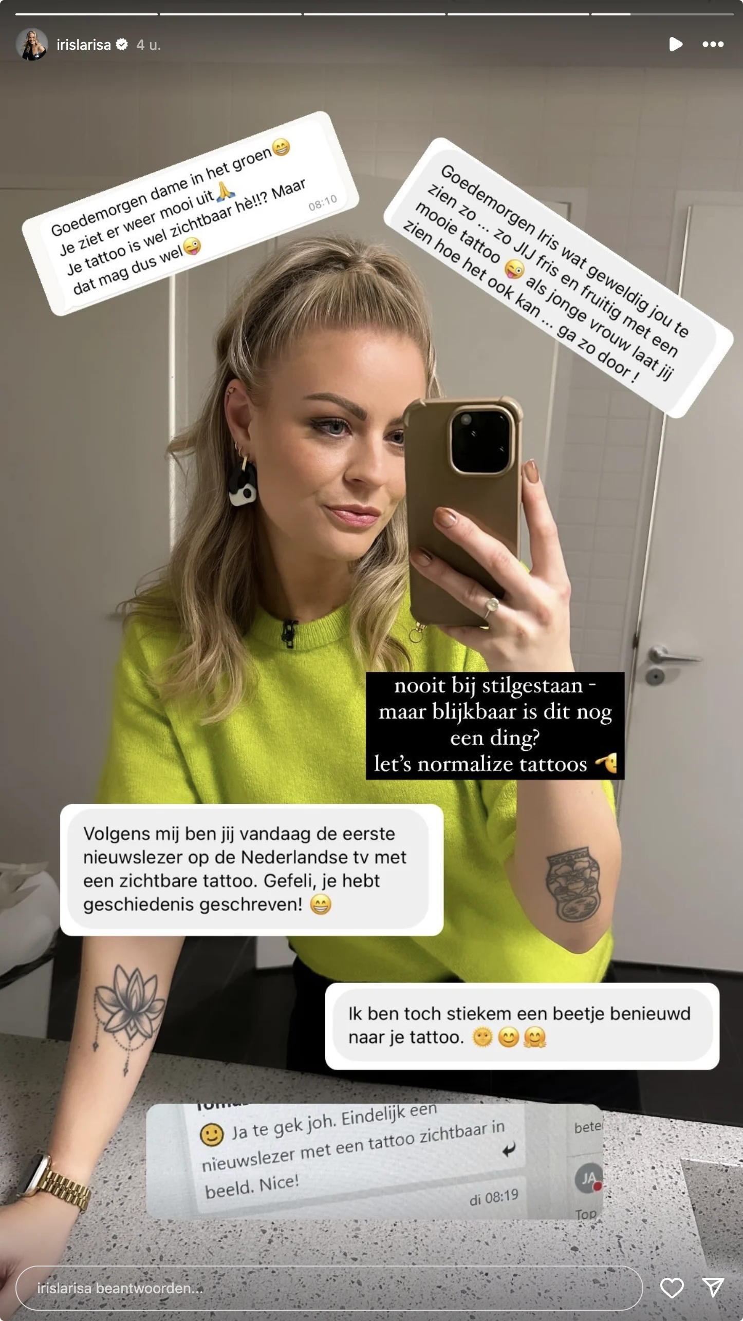 Op Instagram deelt de presentatrice een foto met een paar reacties. Zo schrijft iemand: "Te gek. Eindelijk een nieuwslezer met een tattoo zichtbaar in beeld. Nice!" Iemand anders reageert: "Goedemorgen dame in het groen. Je ziet er weer mooi uit, maar je tattoo is wel zichtbaar hè!"