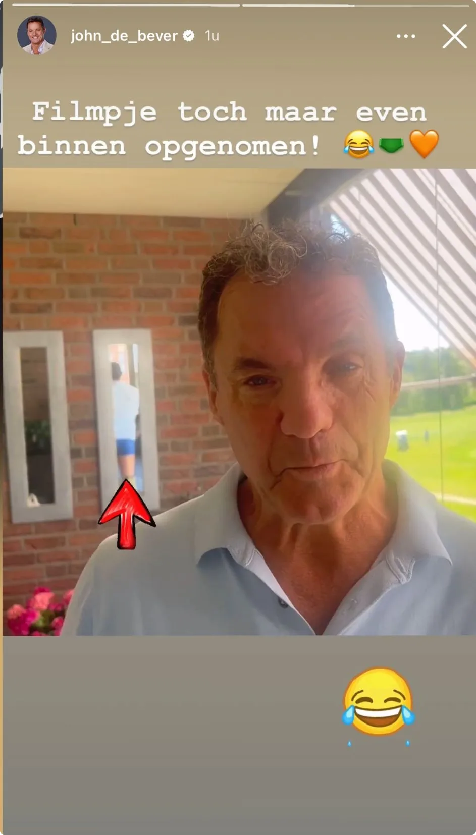 Op zijn Instagram deelt hij een screenshot uit een filmpje, die hij bijna op zijn sociale media had gezet. In de video zien we via de spiegel dat John eigenlijk in zijn onderbroek staat.
