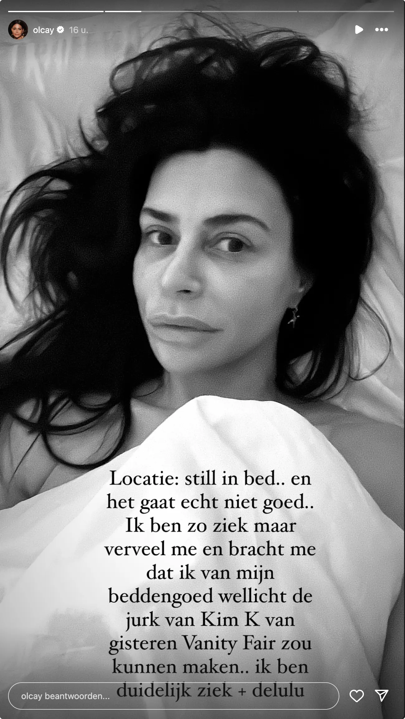 "Locatie: nog steeds in bed en het gaat echt niet goed...", schrijft ze erbij. "Ik ben zo ziek, maar verveel me en bedacht me dat ik van mijn beddengoed wellicht de jurk van Kim Kardashian van gisteren, Vanity Fair, kan maken. Ik ben duidelijk ziek." De creativiteit is dus zeker nog niet weg.