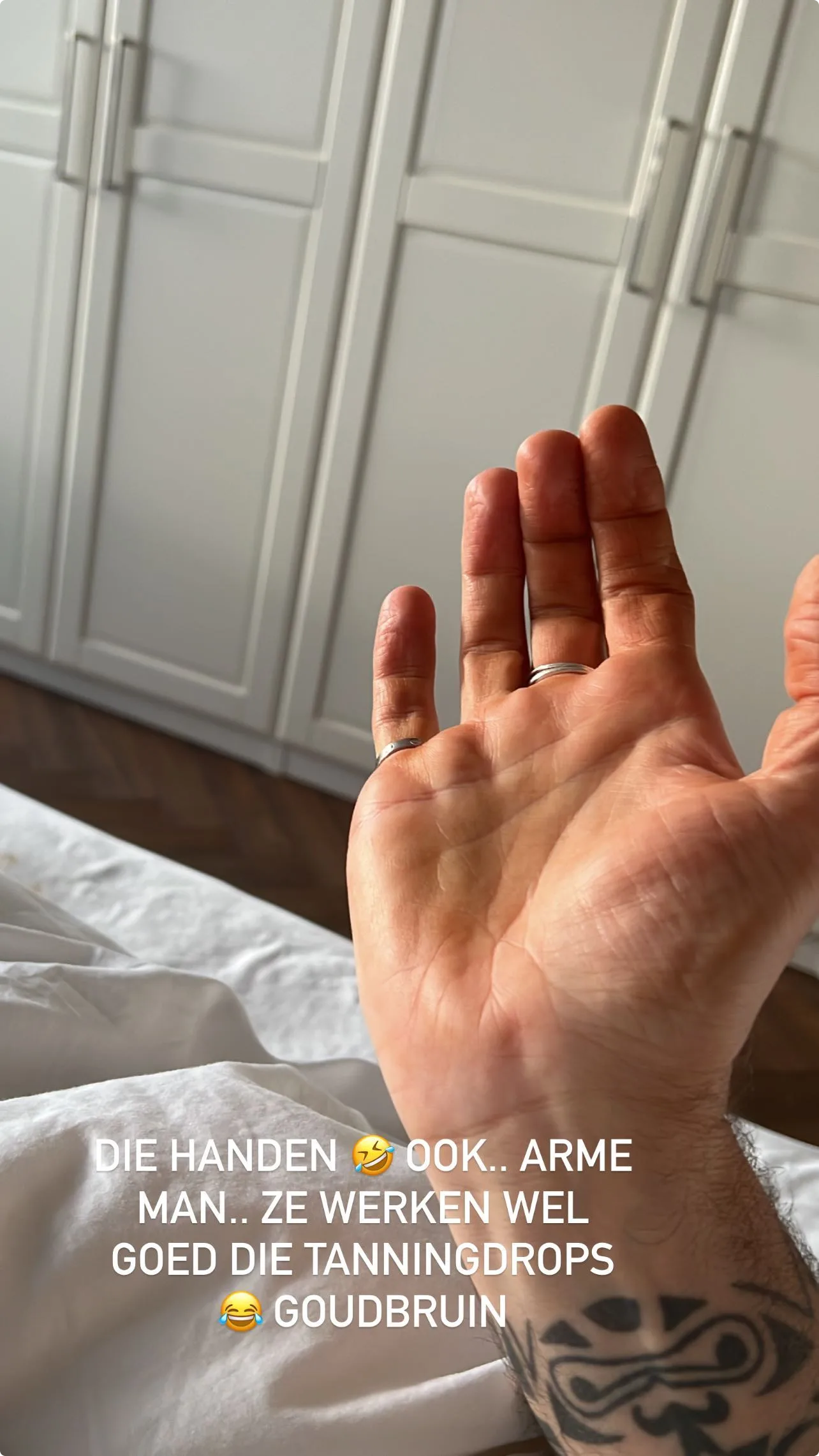 Op haar Instagram Stories deelde Olcay de beelden van een oranje uitziende Ruud. Zo hoor je Ruud roepen: "Ik loop toch voor gek?", waarna hij verder gaat: "Iedereen ziet dat ik eruit zie als een Duitse afgekeurde quizmaster."