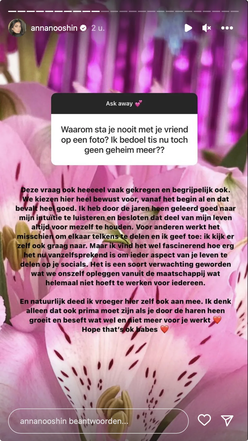 "Deze vraag heb ik al heel vaak gekregen", laat Anna weten. De influencer begrijpt volledig dat er mensen zijn, die zich dit afvragen. "We kiezen hier heel bewust voor en dat bevalt me heel goed", legt Anna uit. "Ik heb door de jaren heen geleerd goed naar mijn intuïtie te luisteren en besloten dit deel van mijn leven voor mezelf te houden", legt ze vervolgens uit.