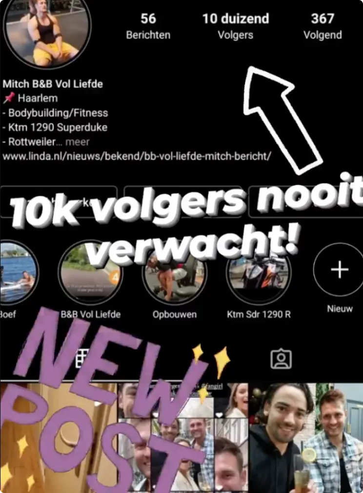 De 10 staat voor de 10.000 volgers die Mitch op Instagram heeft gehaald. De vrijgezelle tv-ster gaat een poging wagen om een gekuisde versie van het fragment alsnog online te krijgen. “Ik probeer hem vanavond aan te passen, zodat de vrouwen op Instagram wat leuks te zien hebben!” Hieronder zie je een screenshot van de Instagrampagina van Mitch, waarop je de post nog in het klein kan zien.