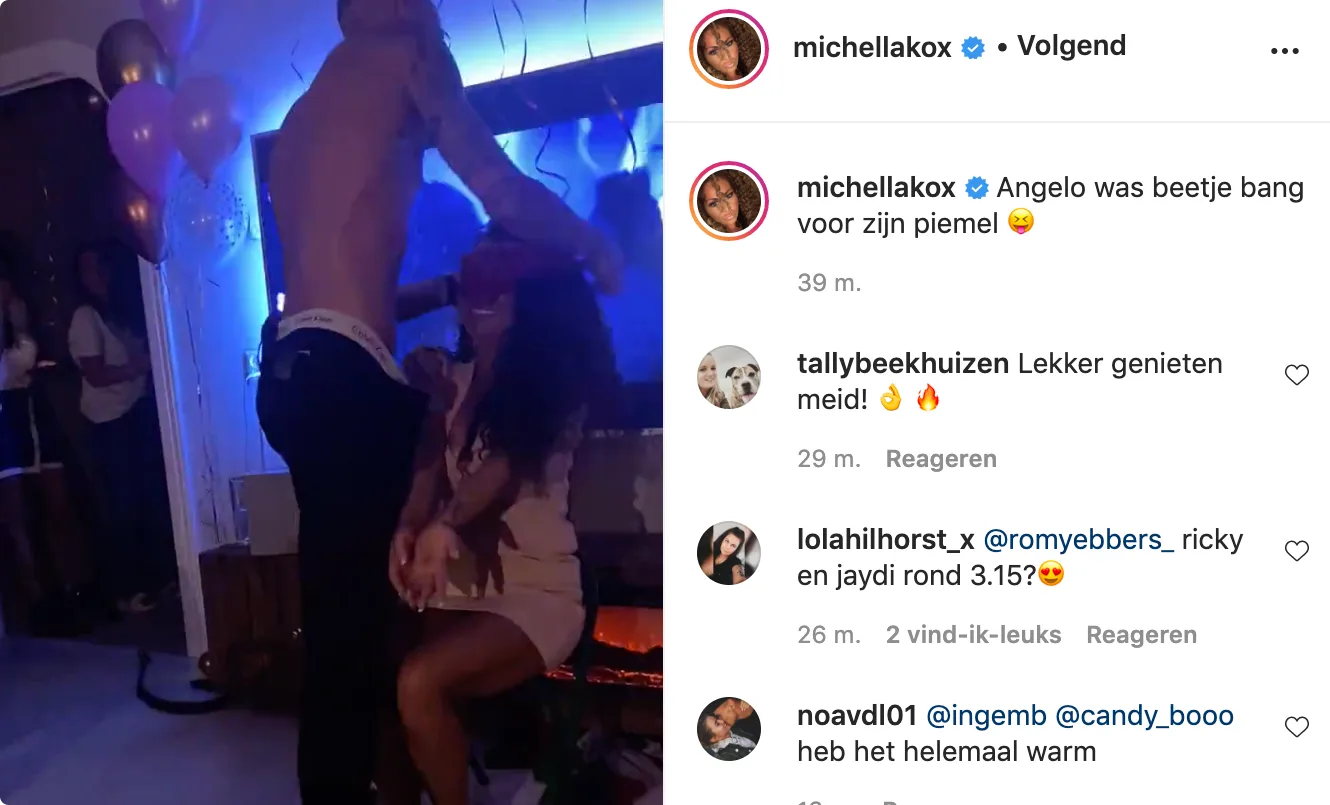 Op Instagram schrijft ze: "OMG Angelo! Wat ik nu krijg en zie, ik ben in shock. Ik heb je net naakt zien klaarkomen in een seksfilm van Kim Holland."