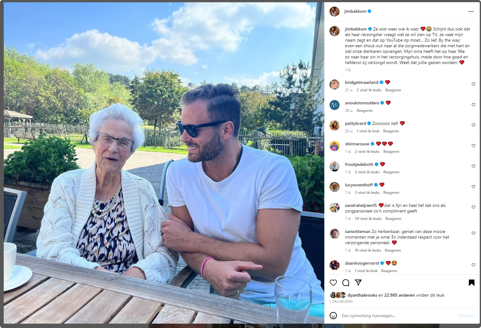 Daarnaast geeft hij ook een shout-out naar haar verzorgers: "By the way: even een shout-out naar al die zorgmedewerkers die met hart en ziel onze dierbaren opvangen. Mijn oma heeft het op haar 96e zo naar haar zin in het verzorgingshuis, mede door hoe goed en liefdevol zij verzorgd wordt. Weet dat jullie gezien worden!"