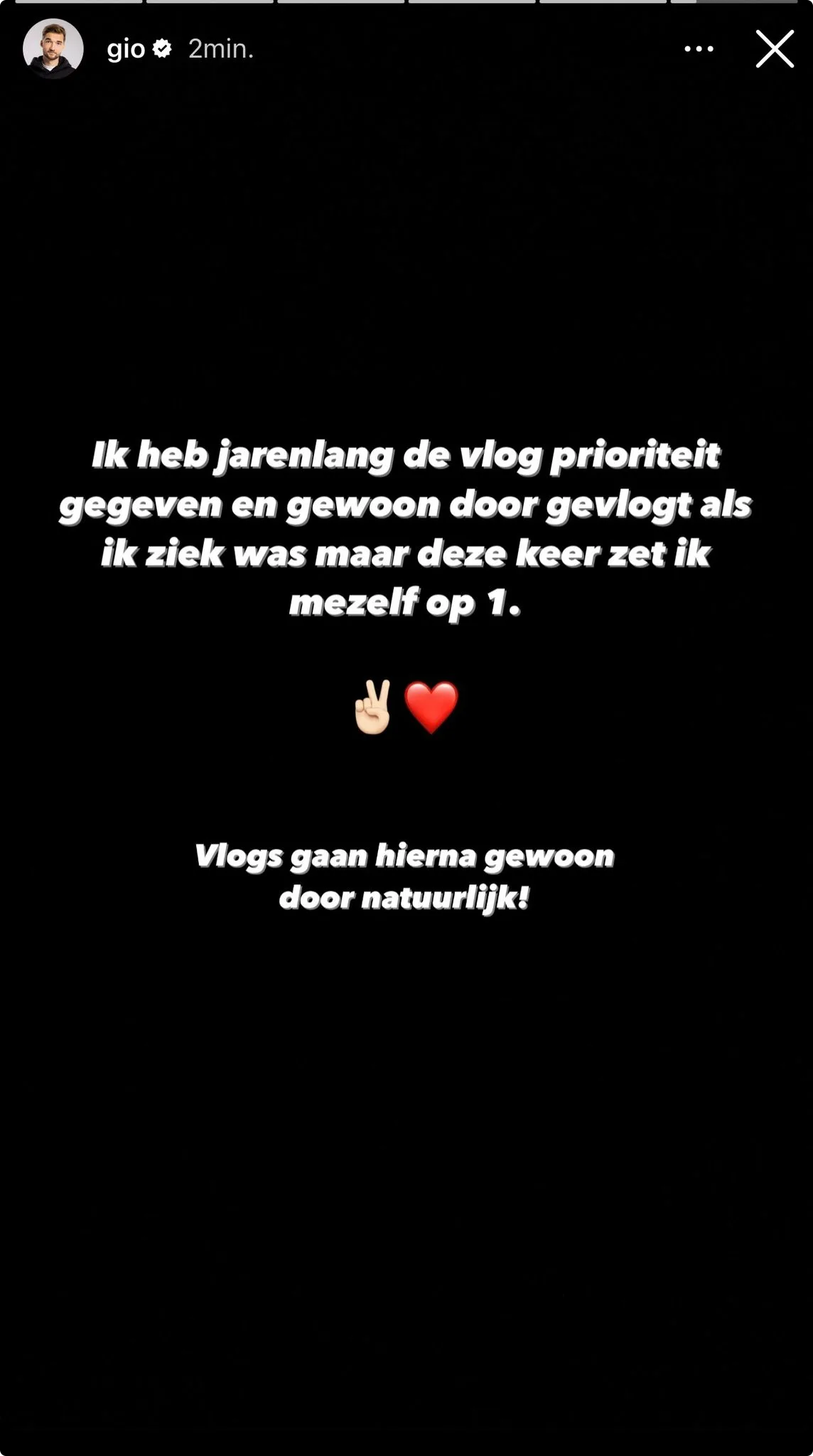 "Vandaag komt er helaas geen video omdat ik ziek ben", deelt Gio op zijn Instagram. "Heb er echt niks van kunnen maken en gezondheid gaat altijd voor. Sorry!" Hij vervolgt: "Ik heb jarenlang de vlog prioriteit gegeven en gewoon door gevlogt als ik ziek was, maar deze keer zet ik mezelf op één."