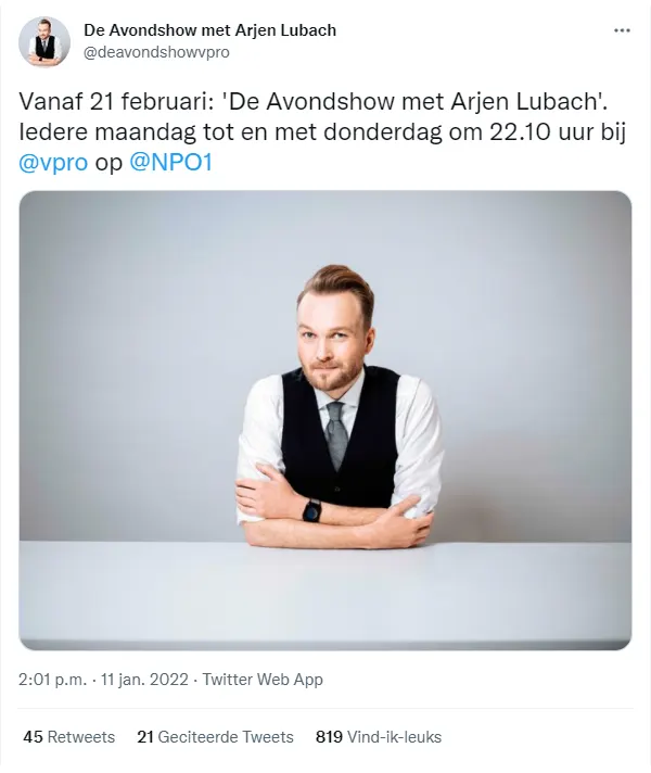 Arjen Lubach heeft de startdatum van zijn nieuwe talkshow De Avondshow - met Arjen Lubach bekendgemaakt. Via Twitter laat de presentator weten wanneer het programma start.