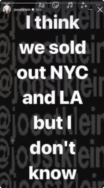 Slechts één dag na de aankondiging kan hij op Instagram melden dat beide concerten in New York en Los Angeles al uitverkocht zijn. Dit bevestigt dat Joost niet alleen in Nederland en Duitsland een grote schare fans heeft, maar ook in de Verenigde Staten.