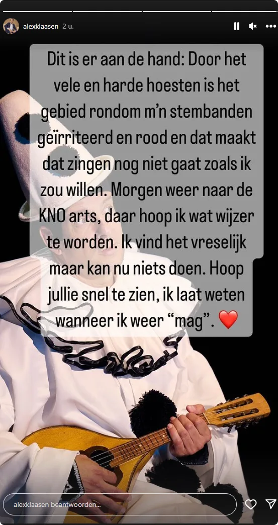 Of de voor donderdagavond geplande voorstelling in Deventer doorgaat, is nog niet duidelijk. "Morgen weer naar de KNO-arts, daar hoop ik wat wijzer te worden. Ik vind het vreselijk, maar kan nu niets doen. Hoop jullie snel te zien, ik laat weten wanneer ik weer 'mag'."