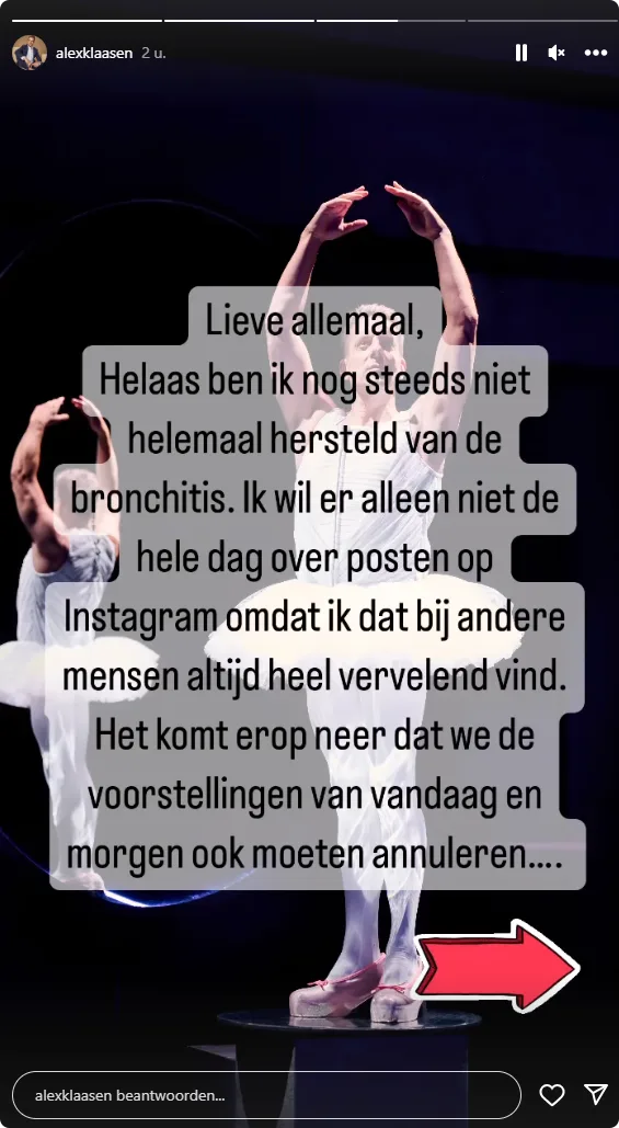 Alex miste de afgelopen weken al meerdere voorstellingen en zou zijn theatertournee No Ponies (zie video), dinsdag weer hervatten. "Helaas ben ik nog steeds niet helemaal hersteld van de bronchitis. Ik wil er alleen niet de hele dag over posten omdat ik dat bij andere mensen altijd heel vervelend vind. Het komt erop neer dat we de voorstellingen van vandaag en morgen ook moeten annuleren", schrijft hij.