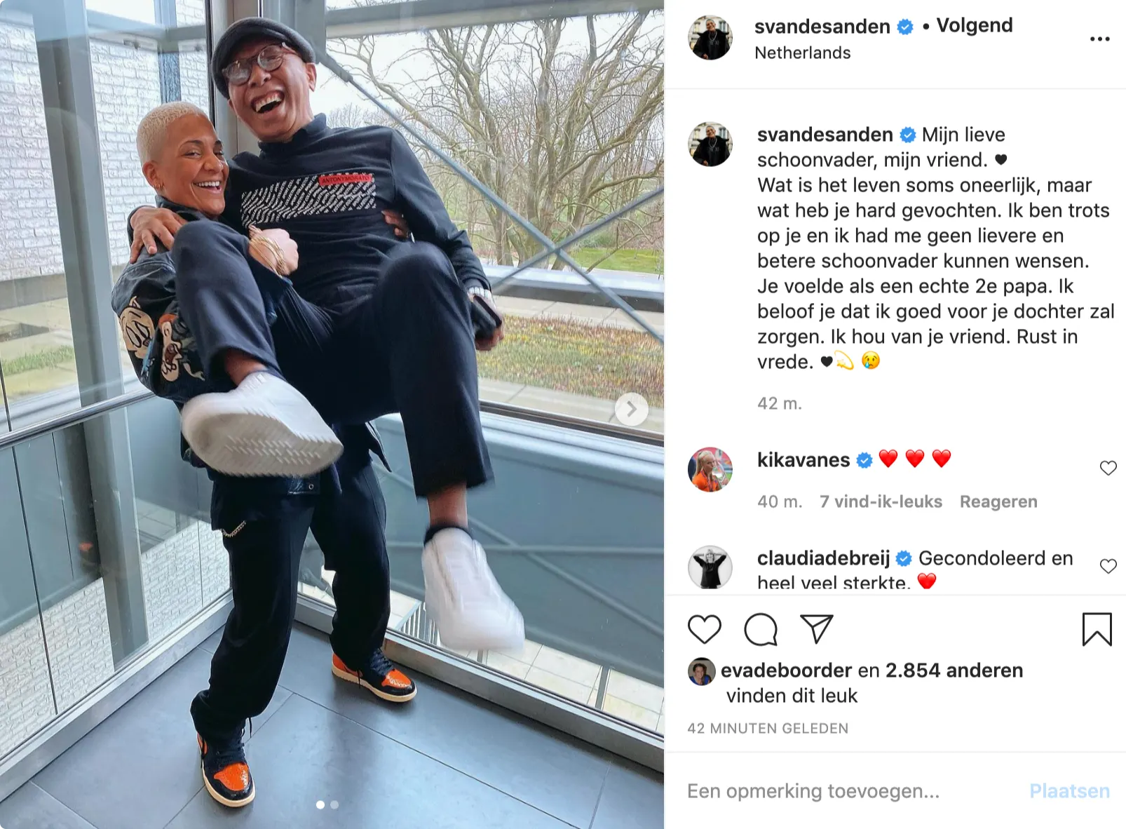 Op Instagram schrijft ze in een emotionele post: "Mijn lieve schoonvader, mijn vriend. Wat is het leven soms oneerlijk, maar wat heb je hard gevochten. Ik ben trots op je en ik had me geen lievere en betere schoonvader kunnen wensen. Je voelde als een echte 2e papa. Ik beloof je dat ik goed voor je dochter zal zorgen. Ik hou van je vriend. Rust in vrede."