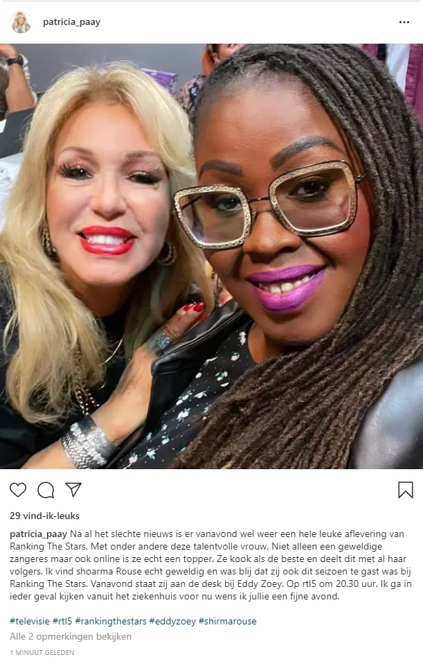 Op Instagram laat Patricia weten hoe blij zij is met de talentvolle zangeres. "Niet alleen een geweldige zangeres maar ook online is ze echt een topper. Ze kookt ook als de beste en deelt dit met al haar volgers. Ik vind 'Shoarma' Rouse echt geweldig en was blij dat zij ook dit seizoen te gast was bij Ranking The Stars".