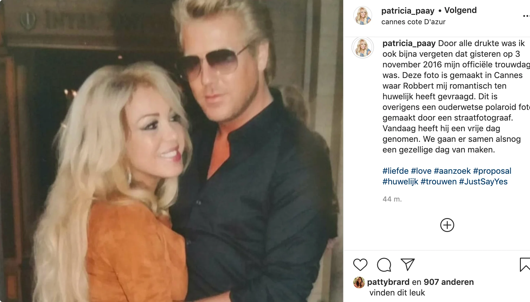 Patricia Paay is nog altijd gelukkig getrouwd met Robbert en op Instagram staat ze op bijzondere wijze stil bij hun trouwdag.