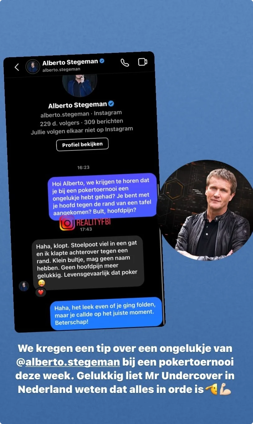 Juicekanaal RealityFBI meldt dat hij een pijnlijk ongelukje heeft gehad. Zijn stoelpoot viel in een gat waardoor hij achterover klapte en zijn hoofd tegen de rand van een tafel stootte. Alberto heeft aan het juicekanaal en aan Shownieuws bevestigd dat dit inderdaad is gebeurd. "Klein bultje, mag geen naam hebben", laat hij weten. En ook grapt hij: "Levensgevaarlijk dat poker."
