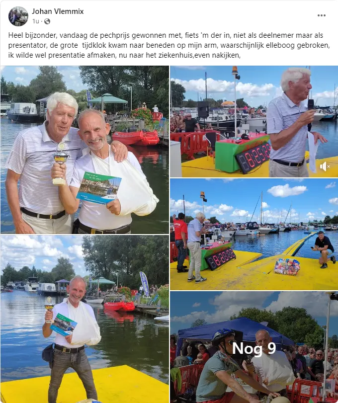 Johan Vlemmix ligt opnieuw in de ziekenboeg. De ondernemer en Oranjefan, die vorige jaar nog een grote verrassing had voor prinses Amalia (zie video), was aanwezig bij een evenement in Zeewolde, toen er een grote, zware klok op zijn arm viel. Daardoor heeft hij waarschijnlijk zijn elleboog gebroken, schrijft Vlemmix in een bericht op Facebook.