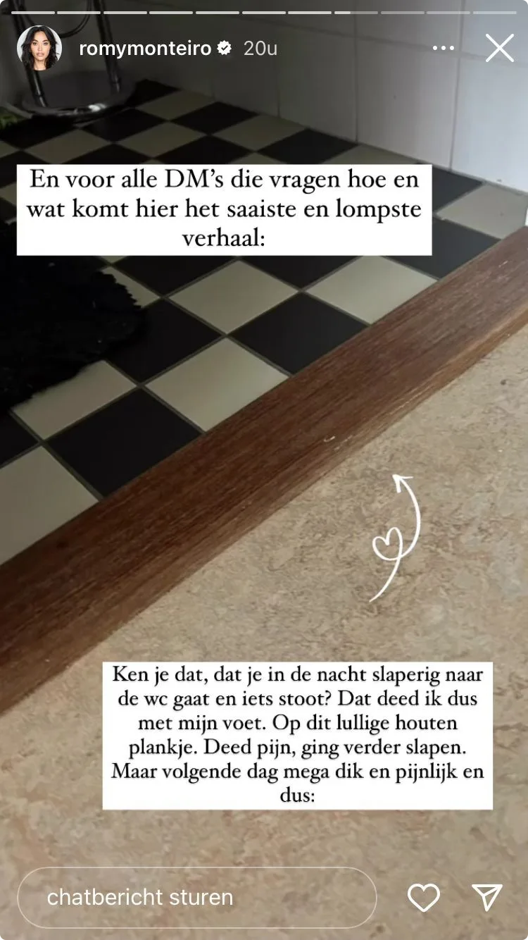 "Hoop dat jullie weekend je beter vergaat", aldus Monteiro op haar Instagram Stories. Ze laat vervolgens weten dat ze 's nachts haar voet heeft gestoten aan een houten plankje. Ze ging toen verder slapen maar haar voet bleek later heel dik en pijnlijk. Ze laat vervolgens een röntgenfoto zien waarop een breuk in haar voet is te zien.