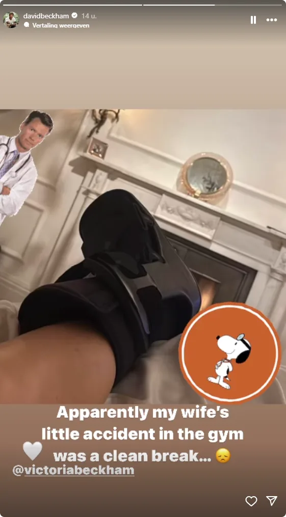Op sociale media deelt David Beckham, die met Victoria is getrouwd, een foto van haar voet in het gips. "Blijkbaar was het kleine ongelukje van mijn vrouw in de sportschool een botbreuk", schrijft hij. Daarbij deelt hij een emoji die droevig kijkt.