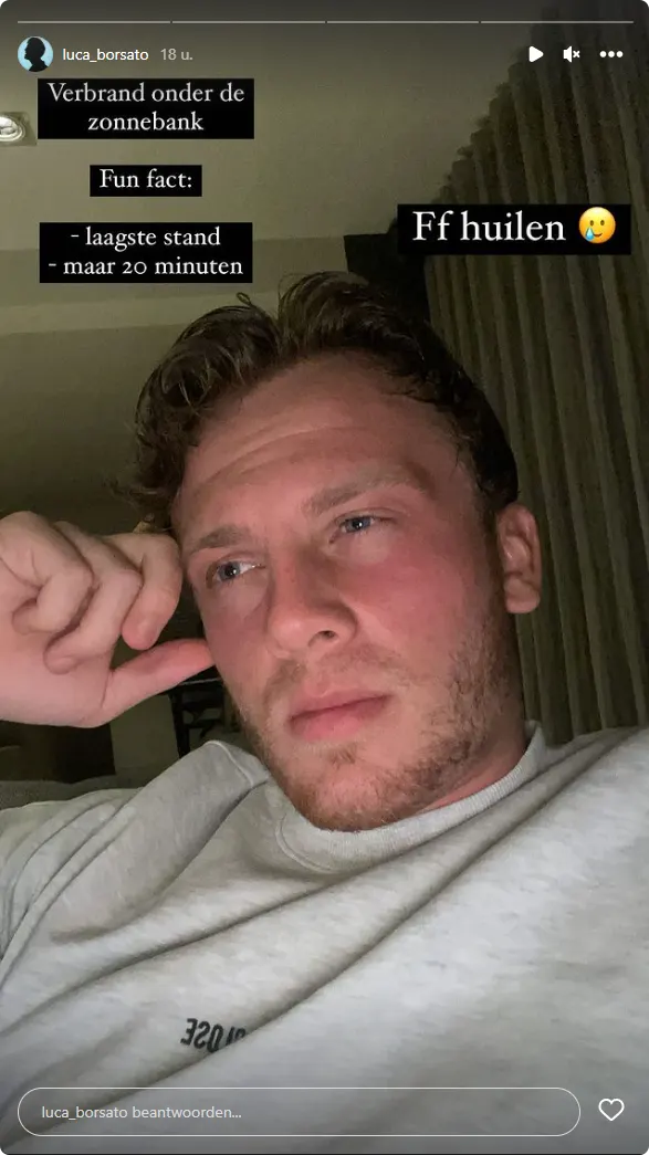 In zijn Stories laat hij weten dat zijn bezoekje aan de zonnebank niet zo prettig is verlopen. "Verbrand onder de zonnebank", schrijft de zanger.