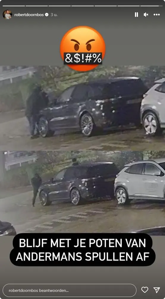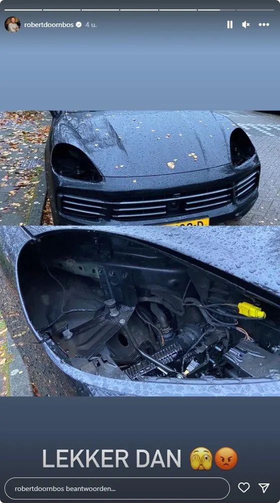 Op zijn Instagramverhaal plaatste de voormalig autocoureur twee verschillende foto's over de roof op zijn Porsche. Zo schreef hij eerst "Lekker dan" en uit hij op de tweede foto zijn woede: "Blijf met je poten van andermans spullen af."
