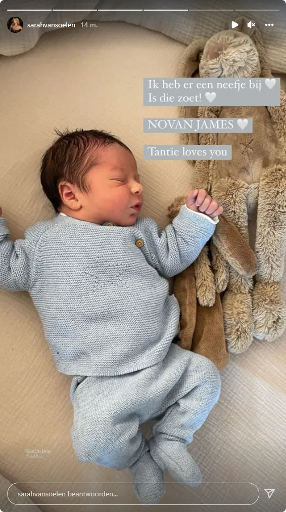De ex van André Hazes deelt lieve foto's van haar gloednieuwe neefje. "Ik heb er een neefje bij. Is die zoet!" schrijft ze erbij. De kleine heeft de naam Novan James gekregen. "Tantie loves you", aldus Sarah.