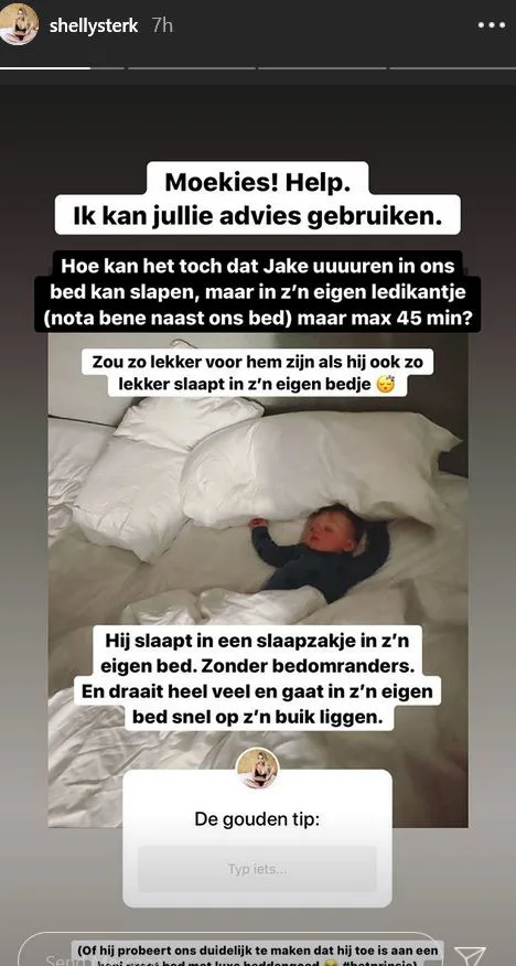 "Moekies! Help", trapt Shelly af in enkele Instagram Stories. "Ik kan jullie advies gebruiken. Hoe kan het toch dat Jake uuuuuren in ons bed kan slapen, maar in zijn eigen ledikantje (nota bene naast ons bed) maar maximaal 45 minuten?" Bij de tekst plaatst ze een foto van de kleine Jake in het grote bed van zijn ouders, presentatrice Shelly en haar man Mark.