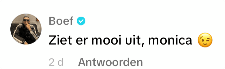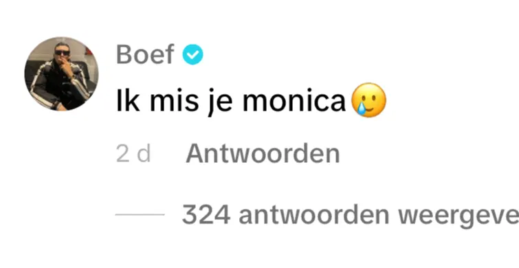 Maar dit is niet de enige reactie die Monica heeft mogen ontvangen van Boef. Onder een andere video schrijft hij nog een opmerkelijke reactie. "Ik mis je Monica", schrijft hij met een verdrietige emotji erachter.