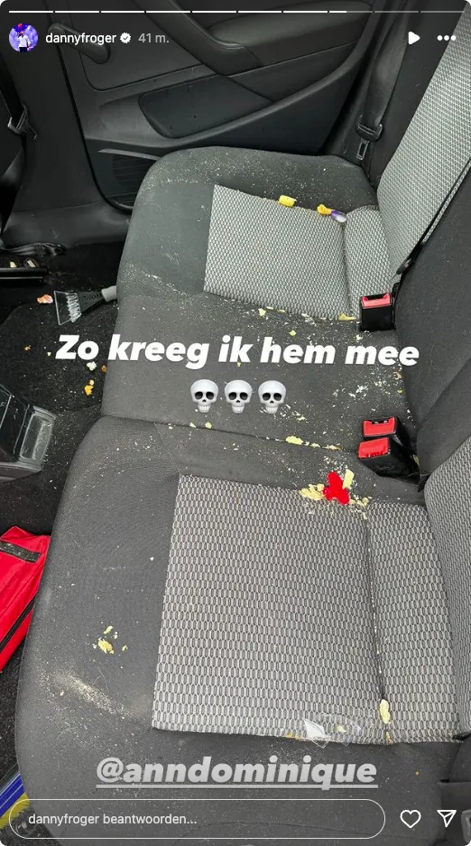 De achterbank van haar auto ligt namelijk helemaal onder de chipskruimels. "Ze geeft dus de kinderen de schuld. Dat is allemaal prima, maar willen jullie zien hoe deze auto eruit ziet?" vraagt hij aan zijn volgers. Even later voegt Danny hier aan toe: "Ik heb nu dus wel een probleem, want ik kom net thuis, staat ze zelf alles te stofzuigen en te dweilen. Dus ik heb een beetje een schuldgevoel om het te plaatsen", zegt de zanger lachend.