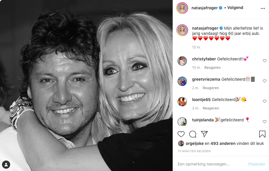 Ook Natasja kan niet achterblijven. Zij plaatst onderstaande foto op social media en schrijft: "Mijn allerliefste lief is jarig vandaag! Nog 60 jaar erbij aub."