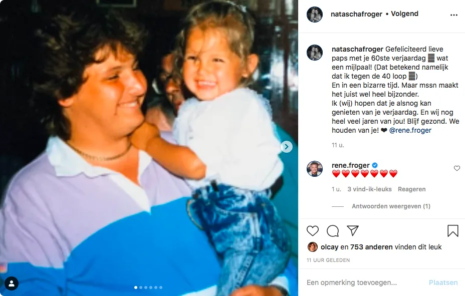 Dochter Natascha heeft ook een verjaardagsboodschap voor haar vader. Ze schrijft: "Gefeliciteerd lieve paps met je 60ste verjaardag. Wat een mijlpaal! (Dat betekent namelijk dat ik tegen de 40 loop) En in een bizarre tijd. Maar mssn maakt het juist wel heel bijzonder. Ik (wij) hopen dat je alsnog kan genieten van je verjaardag. En wij nog heel veel jaren van jou! Blijf gezond. We houden van je!"