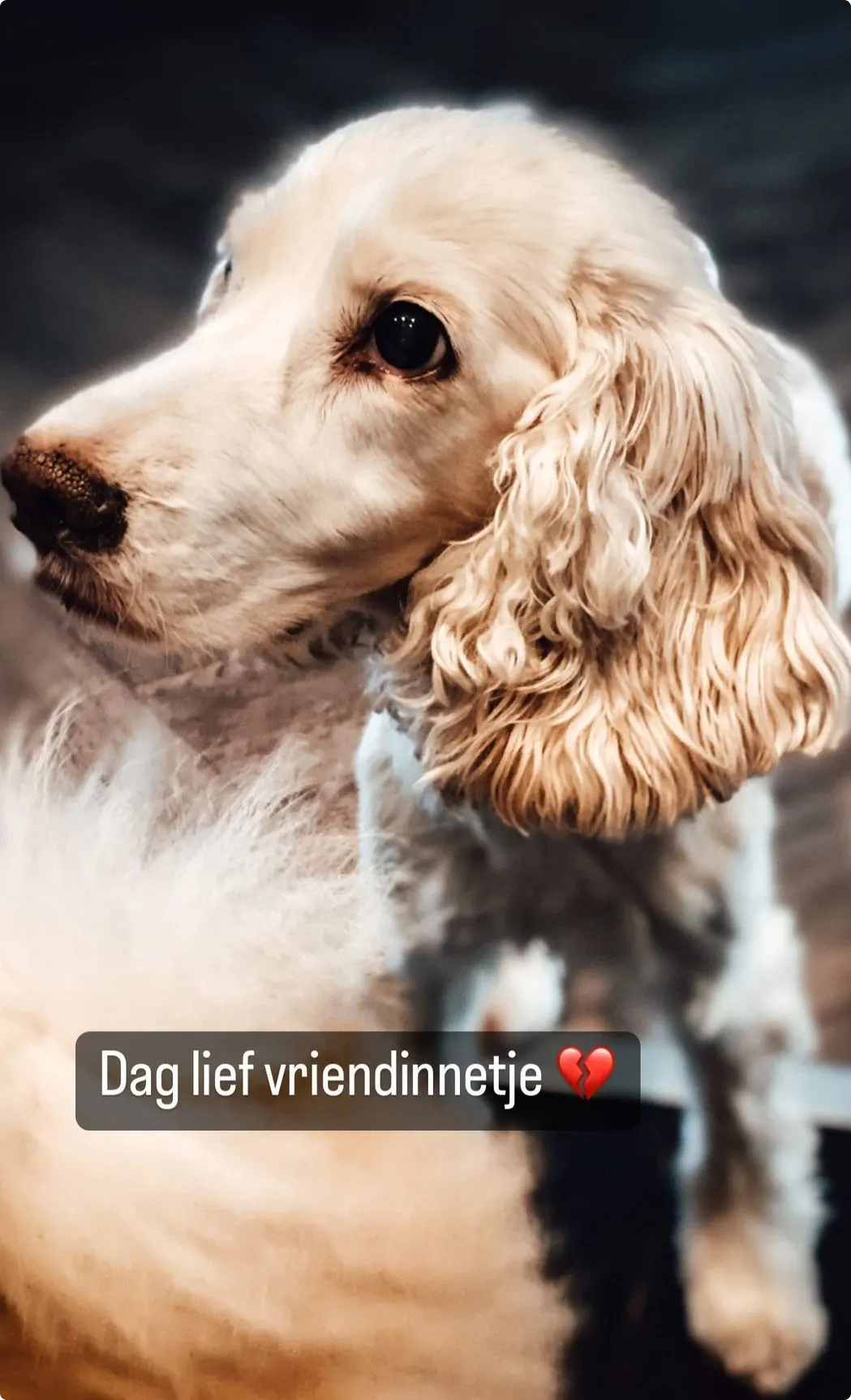 Minouche deelt het verdrietige bericht in haar Instagram Stories met een foto van hun trouwe viervoeter. "Dag lief vriendinnetje", schrijft ze erbij met een gebroken hartje. René reageerde zichtbaar emotioneel in de uitzending van Vandaag Inside en dat fragment is in de video bovenaan de pagina te zien.