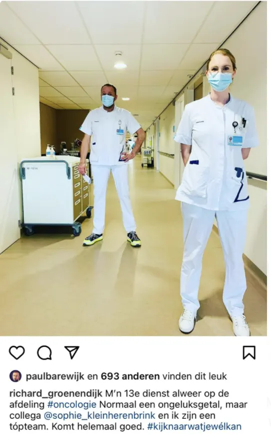 Richard Groenendijk heeft een carrièreswitch gemaakt. De cabaretier, die eerder al zei te overwegen terug de zorg in te gaan, deelt dinsdag een foto van zichzelf op een oncologie-afdeling.