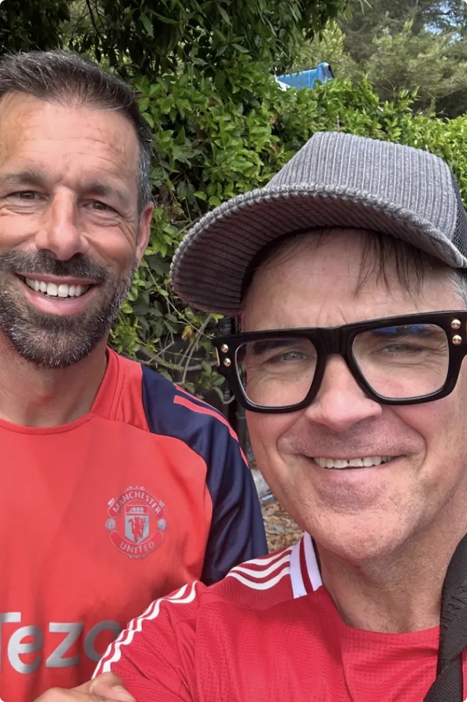 Robbie Williams heeft zaterdag een opvallende selfie op Instagram geplaatst. De zanger strikte oud-voetballer Ruud van Nistelrooij voor een foto en voelde zich weer "even 14", zo schrijft hij erbij.