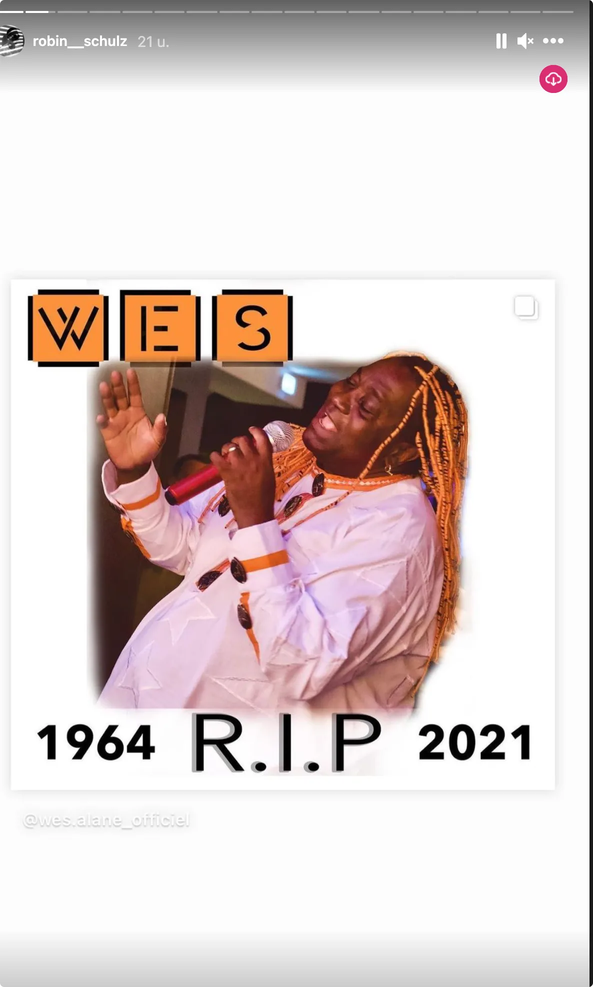 Robin Schulz heeft geschrokken gereageerd op het overlijden van Wes, bekend van de wereldhit Alane. Op Instagram staat de Duitse dj stil bij de dood van de Kameroense zanger en wenst hij familie en vrienden veel sterkte toe.