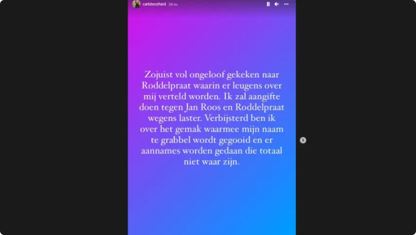 "Ik zal aangifte doen tegen Jan Roos en Roddelpraat wegens laster. Verbijsterd ben ik over het gemak waarmee mijn naam te grabbel wordt gegooid en er aannames worden gedaan die totaal niet waar zijn", aldus Carlo.