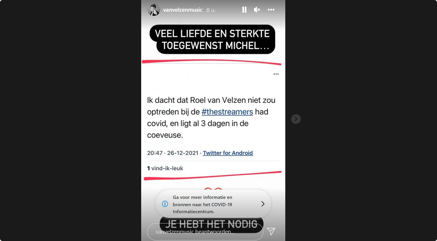 "Ik dacht dat Roel van Velzen niet zou optreden bij The Streamers", schrijft de man op het sociale medium. "Had COVID en ligt al 3 dagen in de couveuse."