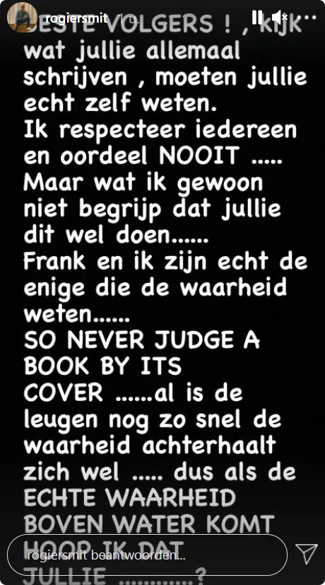Op zijn Instagram Stories roept hij vervolgens op tot meer respect. "Frank en ik zijn echt de enigen die de waarheid weten. (...) Al is de leugen nog zo snel, de waarheid achterhaalt hem wel. Dus als de waarheid boven water komt, hoop ik dat jullie....... ??" sluit hij af in zijn kenmerkende punten-, vraagtekens en hoofdlettersstijl.
