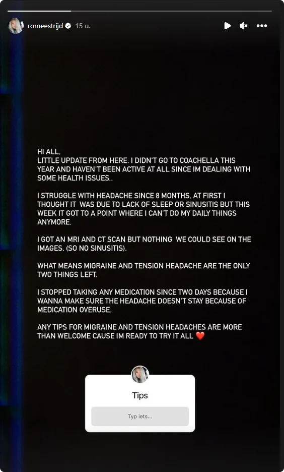 Romee vraagt haar volgers om tips tegen migraine en drukkende hoofdpijn.